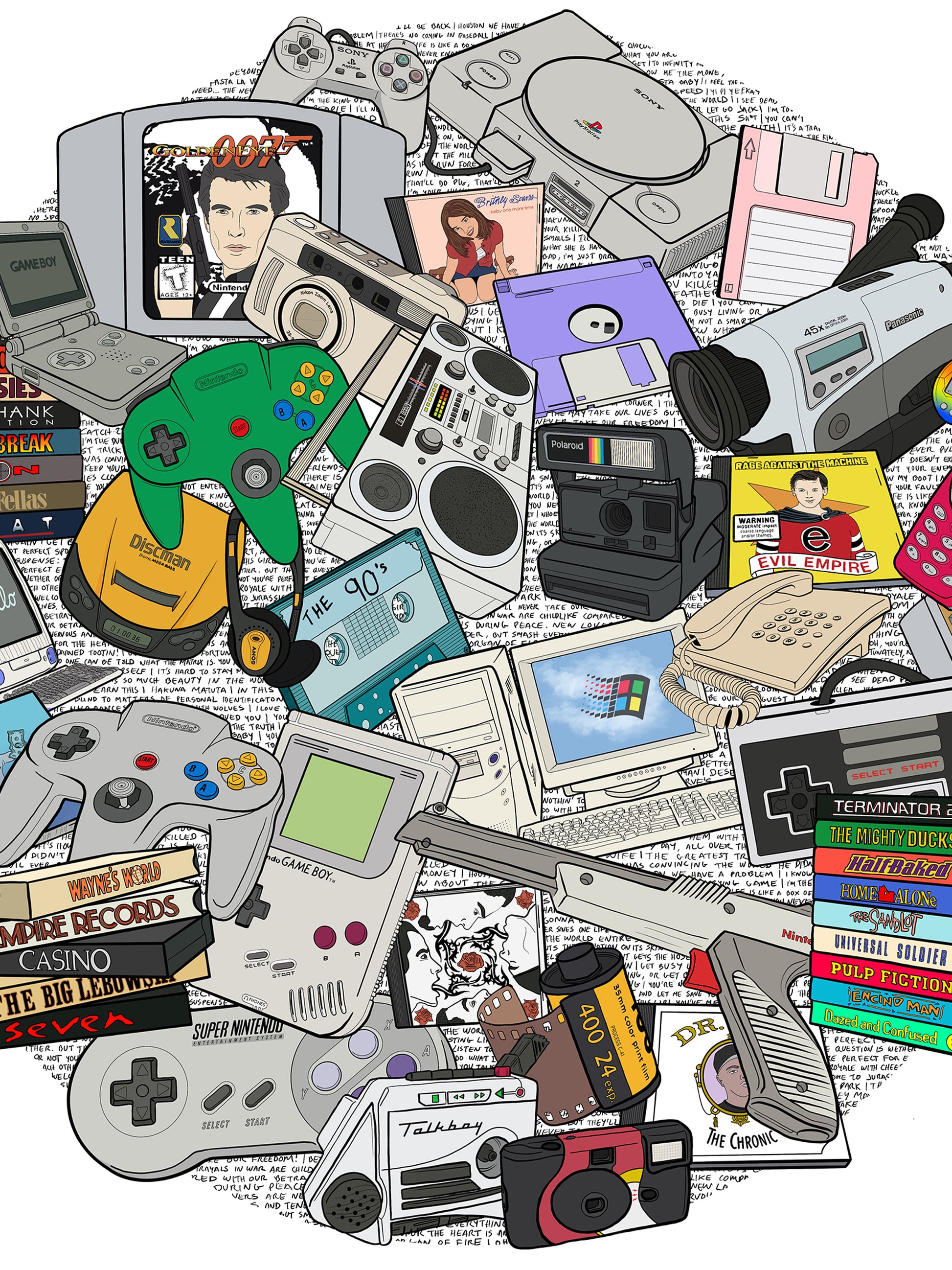 - Featuring: Talkboy, Nintendo, Super Nintendo, Nintendo 64, Playstation, Nokia, Zelda, Goldeneye 007, Gameboy, Apple, Nirvana, Red Hot Chili Peppers, Britney Spears, Rage Against the Machine, Dre Dre, Discman, Polaroid, Jurassic Park, Newsies, The Maighty Ducks, Dazed and Confused, Pulp Fiction, among others.