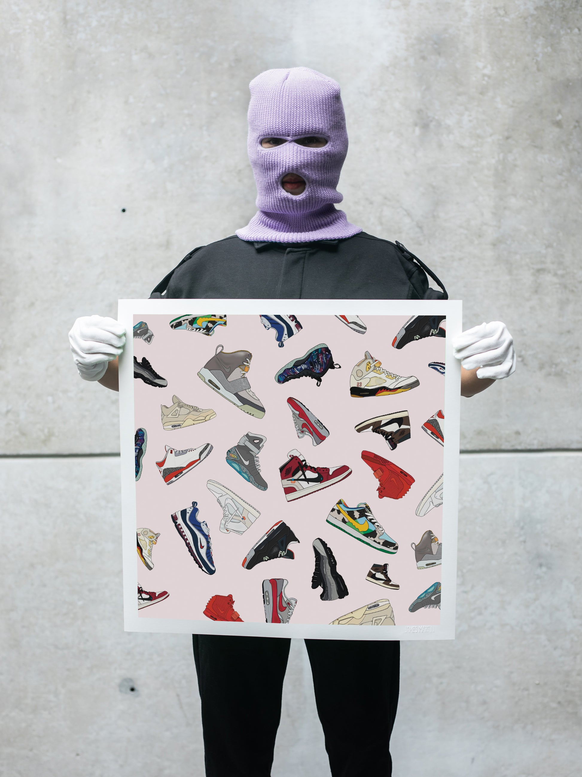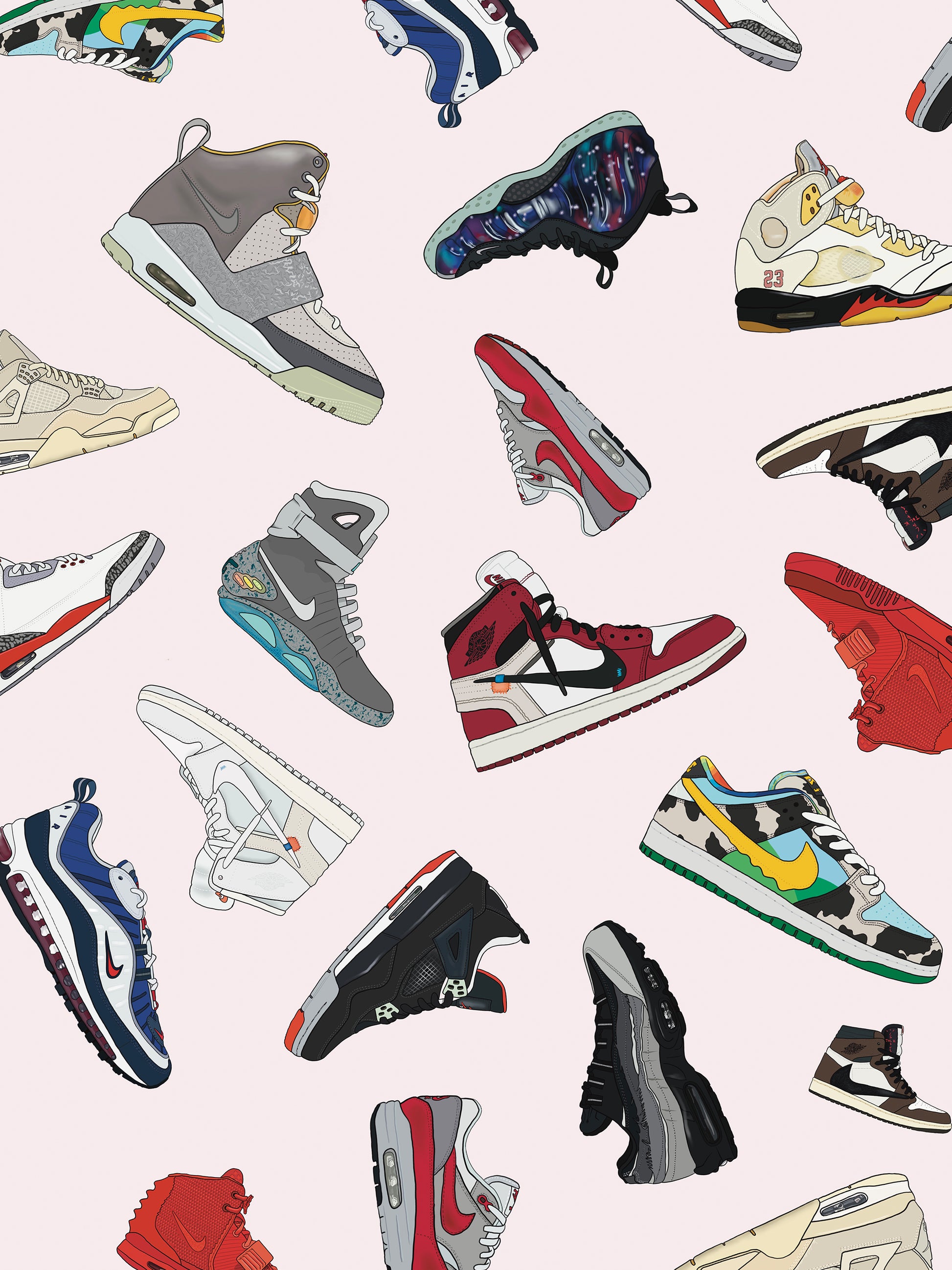 - "Snicker Collage" is a digitally illustrated artwork of several Nike iconic shoes.