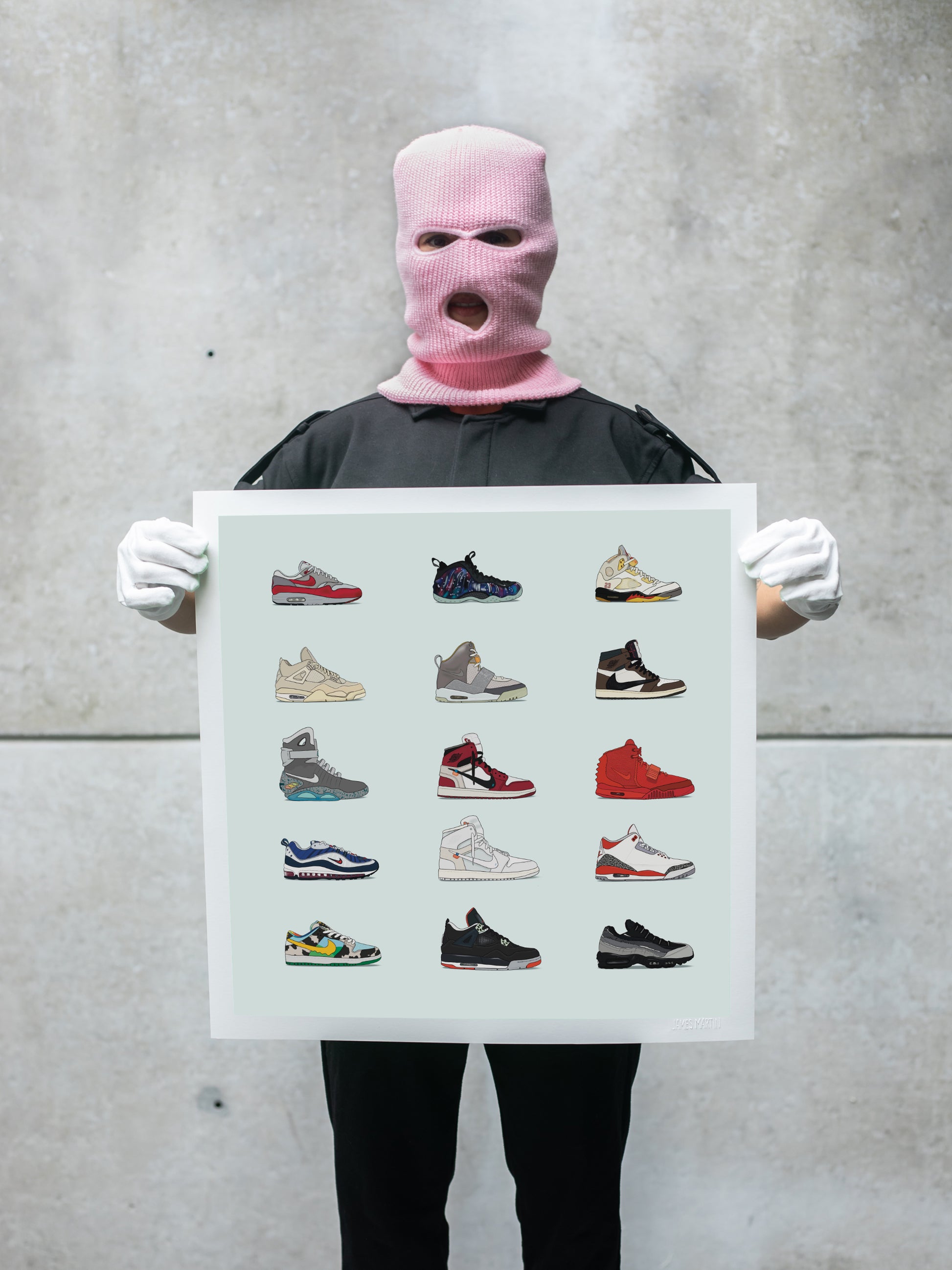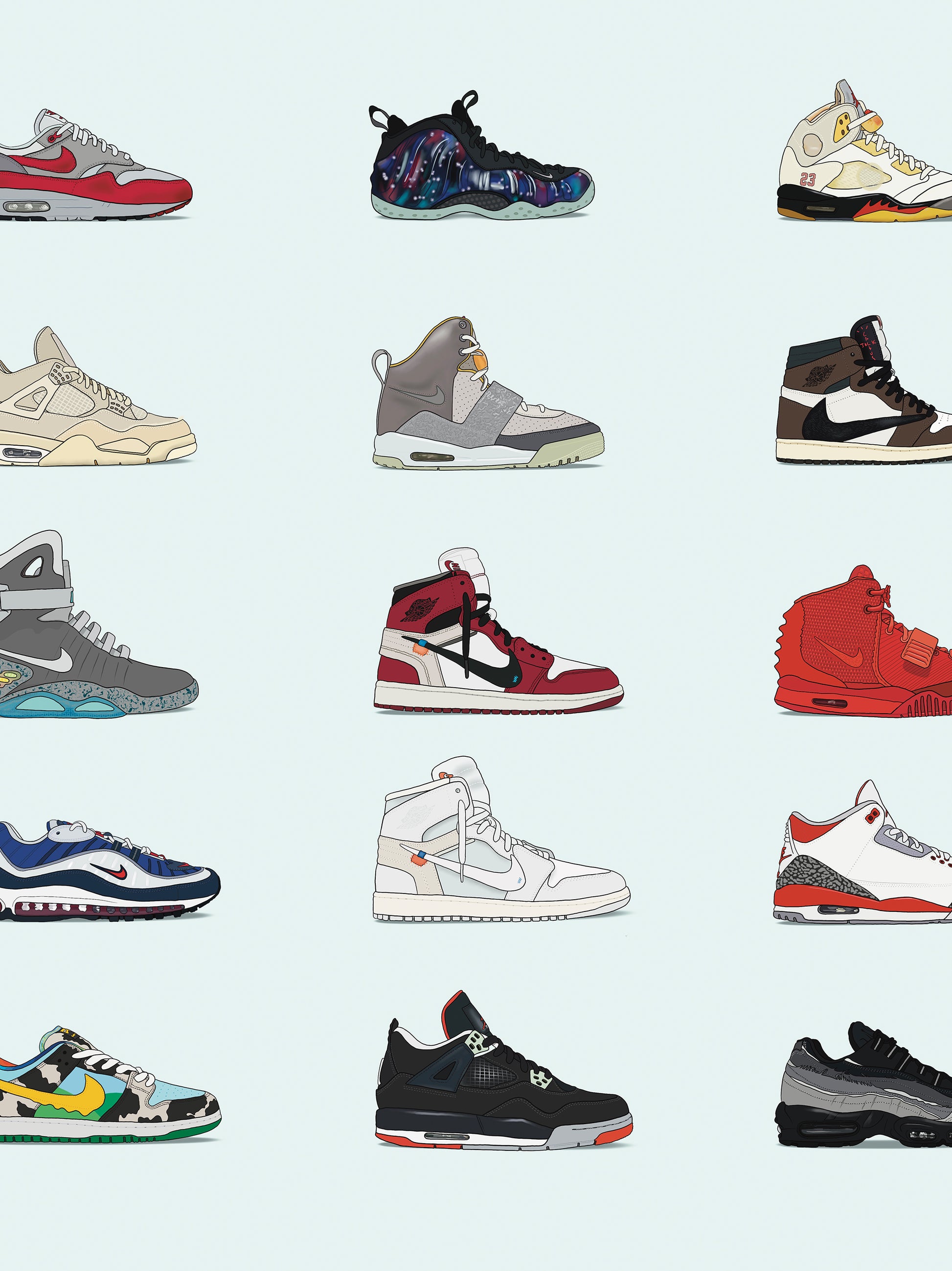 - "Snicker Grid" is a digitally illustrated artwork of several Nike iconic shoes.